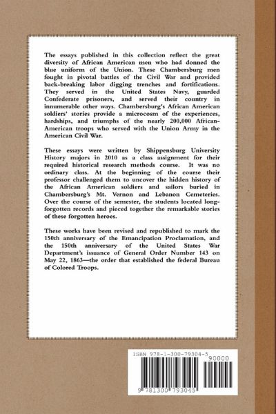 These essays were written by Shippensburg University History majors in 2010 as a class assignment for their required historical research methods course. It was no ordinary class. At the beginning of the course their professor challenged them to uncover the hidden history of the African-American soldiers and sailors buried in Chambersburg's Mt. Vernon and Lebanon Cemeteries. Over the course of the semester, the students located long-forgotten records and pieced together the remarkable stories of these forgotten heroes. These works have been revised and republished to mark the 150th anniversary of the Emancipation Proclamation, and the 150th anniversary of the United States War Department's issuance of General Order Number 143 on May 22, 1863-the order that established the federal Bureau of Colored Troops.