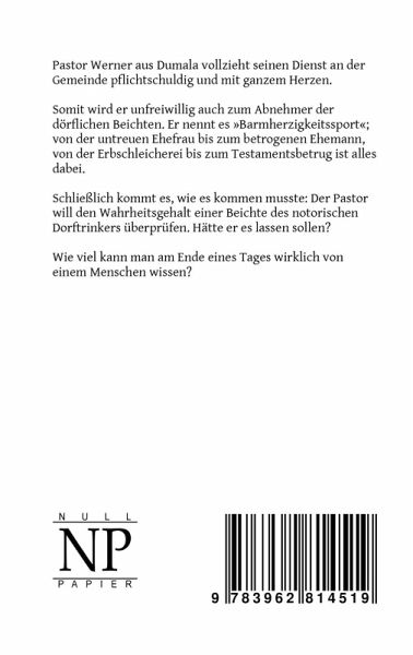 Somit wird er unfreiwillig auch zum Abnehmer der dörflichen Beichten. Er nennt es »Barmherzigkeitssport«; von der untreuen Ehefrau bis zum betrogenen Ehemann, von der Erbschleicherei bis zum Testamentsbetrug ist alles dabei.