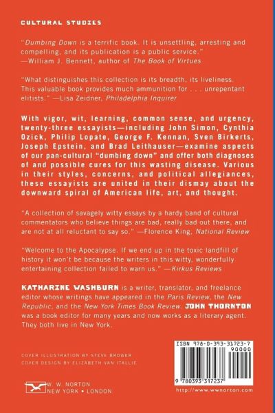 With vigor, wit, learning, common sense, and urgency, twenty-three essayist-including John Simon, Cynthia Ozick, Phillip Lopate, George F. Kennan, Sven Birkerts, Joseph Epstein, and Brad Leithauser-examine aspects of our pan-cultural "dumbing down" and offer both diagnoses of and possible cures for this wasting disease.