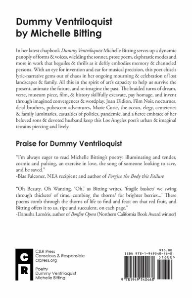 In her latest chapbook Dummy Ventriloquist Michelle Bitting serves up a dynamic panoply of forms & voices, wielding the sonnet, prose poem, ekphrastic modes and more in work that beguiles & thrills as it deftly embodies memory & channeled persona. With an eye for invention and ear for musical precision, this poet chisels lyric-narrative gems out of chaos in her ongoing mourning & celebration of lost landscapes & family. All this in the spirit of art's capacity to help us survive the present, animate the future, and re-imagine the past. The braided turns of dream, verse, museum piece, film, & history skillfully excavate, pay homage, and invent through imagined convergences & wordplay. Joan Didion, Film Noir, nocturnes, dead brothers, pubescent adventures, Marie Curie, the ocean, elegy, cemeteries & family luminaries, casualties of politics, pandemic, and a fierce embrace of her beloved sons & devoted husband keep this Los Angeles poet's urban & imaginal terrains piercing and lively.