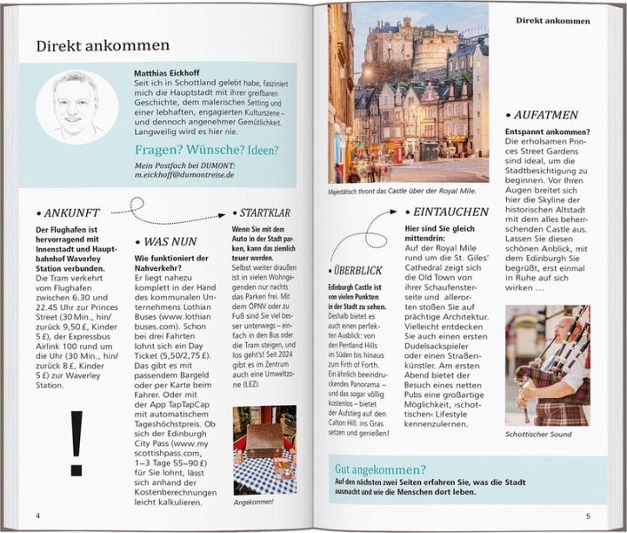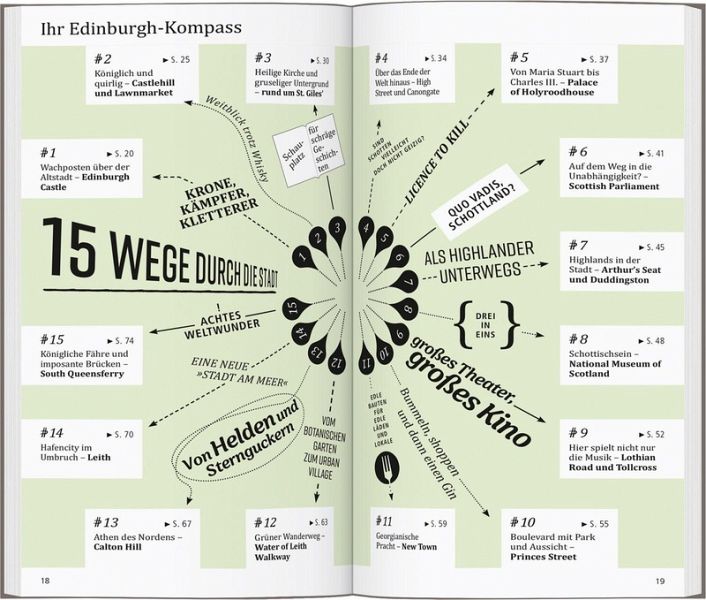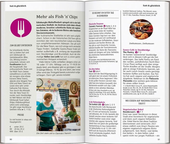 Nach einer kurzen Zusammenfassung über die Stadt, geht es auch direkt auch Erkundungstour. Einzelne Punkte werden näher vorgestellt, egal ob bestimmte Plätze, Museen, Gebäude oder Denkmäler. Neben den wichtigsten Infos, gibt es eine kleine Übersicht von allem was sich in der Nähe befindet und einen Besuch lohnt, z.B. einem schönen Café, samt Öffnungszeiten. Die kleine mit auszugsweise abgebildete Straßenkarte hilft, das angestrebte Ziel schnell und unkompliziert zu finden.
