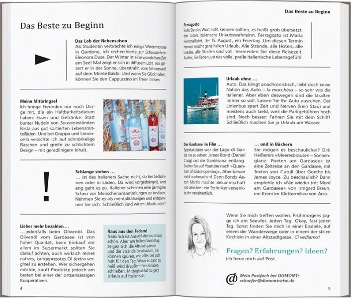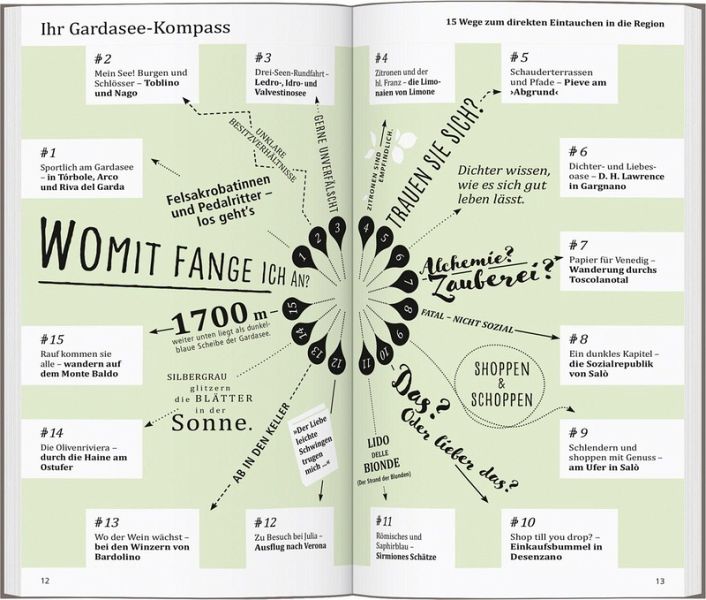 Dank vieler Tipps und Adressen erfahren Sie, wo es sich in fremden Betten gut schläft, wo Sie glücklich satt werden, wohin die Menschen am Gardasee zum Stöbern und Entdecken gehen und wohin es sie zieht, wenn die Nacht beginnt.