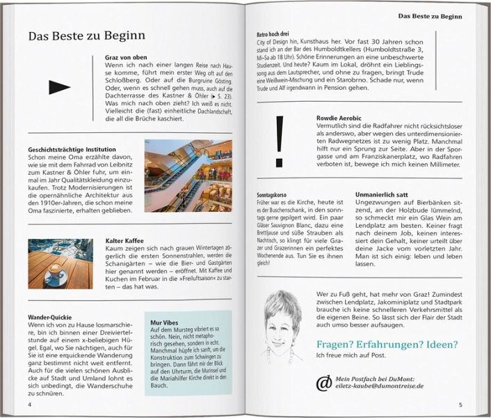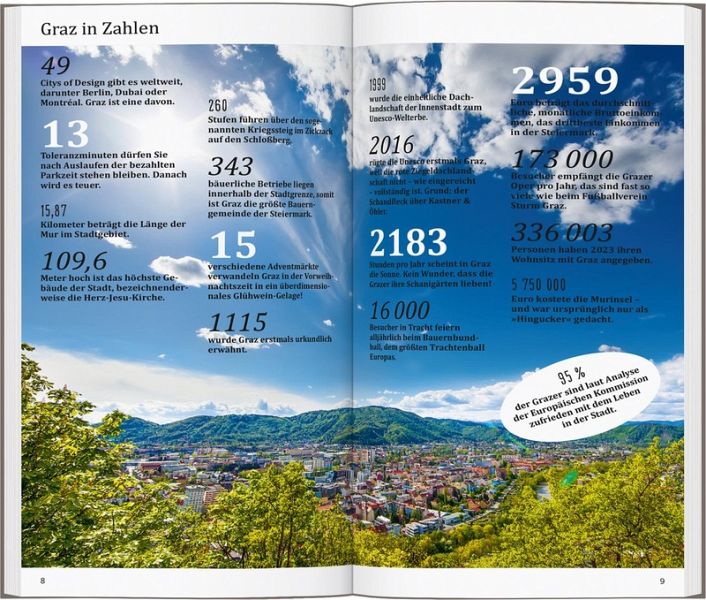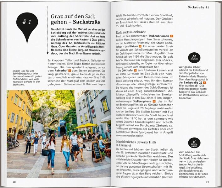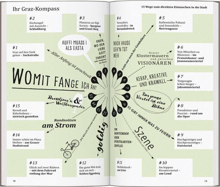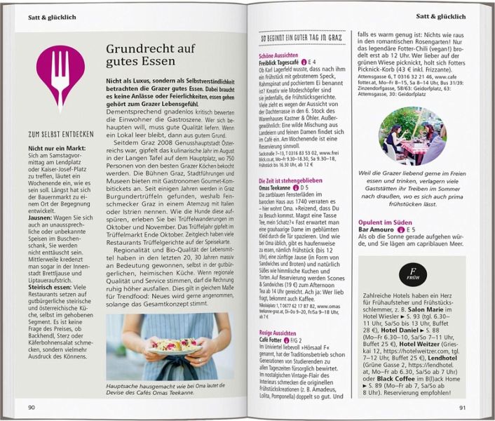 In eigenen Kapiteln erfahren Sie, wo es sich in fremden Betten gut schläft, wo Sie glücklich satt werden, wohin die Grazer zum Stöbern und Entdecken gehen und wohin es sie zieht, wenn die Nacht beginnt.