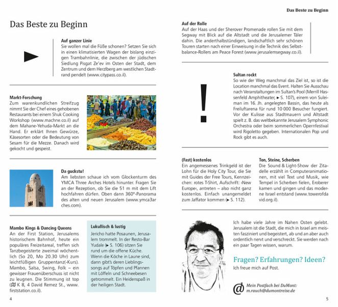 Das Beste zu Beginn. Das ist Jerusalem. Jerusalem in Zahlen. Was ist wo? Augenblicke. Ihr Jerusalem-Kompass. 15 Direktkapitel. Jerusalemer Museumslandschaft. Jerusalem künstlerisch. Jerusalem sakral. Pause - einfach mal abschalten. In fremden Betten. Satt & glücklich. Stöbern & entdecken. Wenn die Nacht beginnt. Hin & weg. O-Ton Jerusalem. Kennen Sie die?