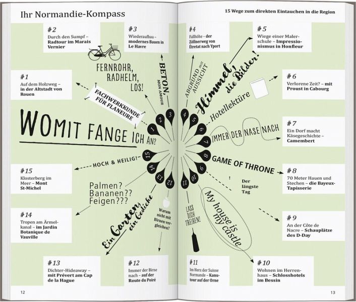 In eigenen Kapiteln erfahren Sie, wo es sich in fremden Betten gut schläft, wo Sie glücklich satt werden, wohin die Normannen zum Stöbern und Entdecken gehen und wohin es sie zieht, wenn die Nacht beginnt.