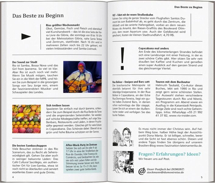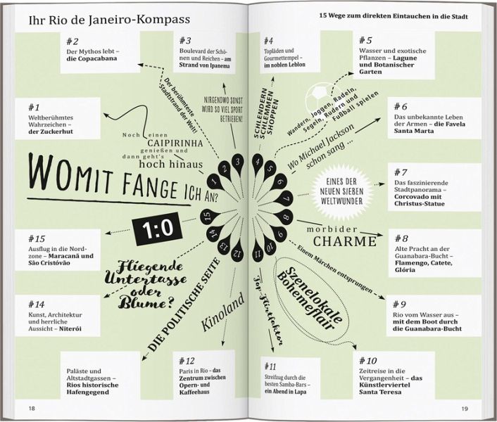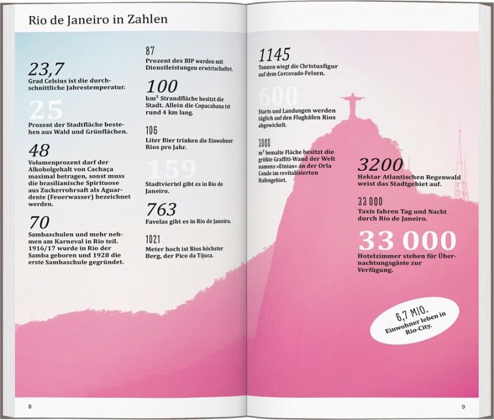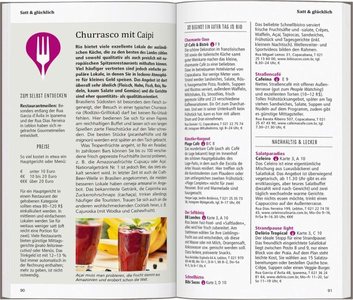 In eigenen Kapiteln erfahren Sie, wo es sich in fremden Betten gut schläft, wo Sie glücklich satt werden, wohin die Cariocas, wie die Einwohner von Rio de Janeiro heißen, zum Stöbern und Entdecken gehen und wohin es sie zieht, wenn die Nacht beginnt.