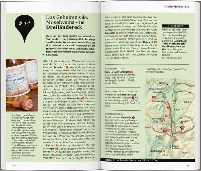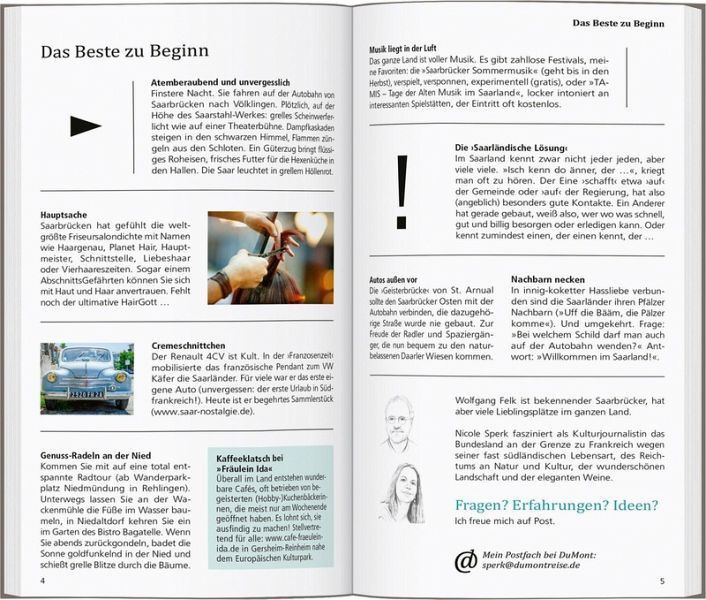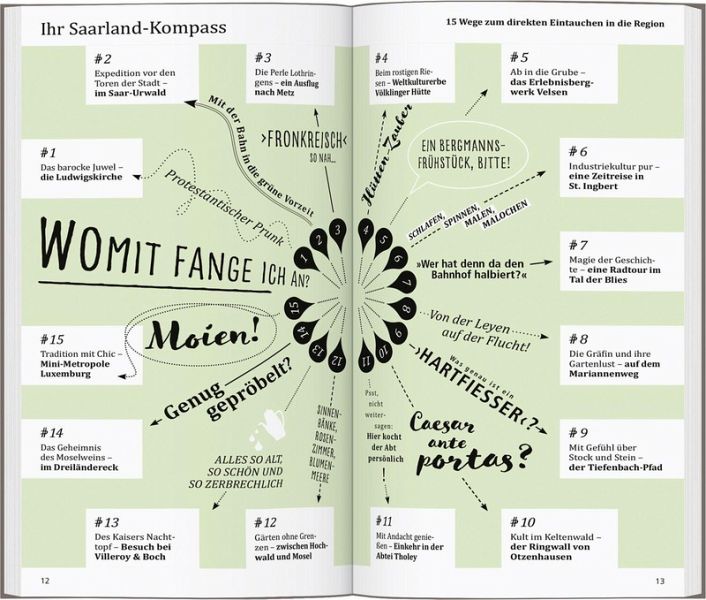 Dank vieler Tipps und Adressen erfahren Sie, wo es sich in fremden Betten gut schläft, wo Sie glücklich satt werden, wohin die Menschen im Saarland zum Stöbern und Entdecken gehen und wohin es sie zieht, wenn die Nacht beginnt.