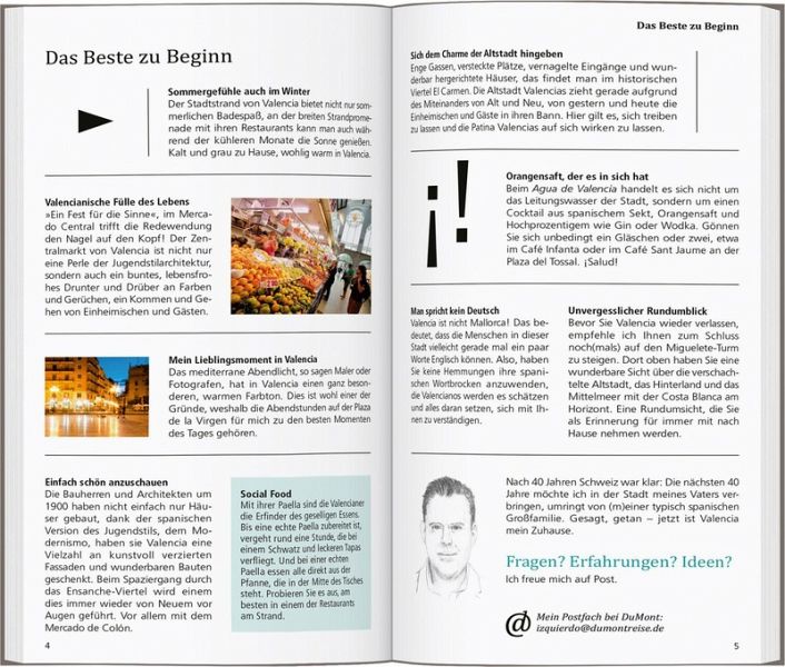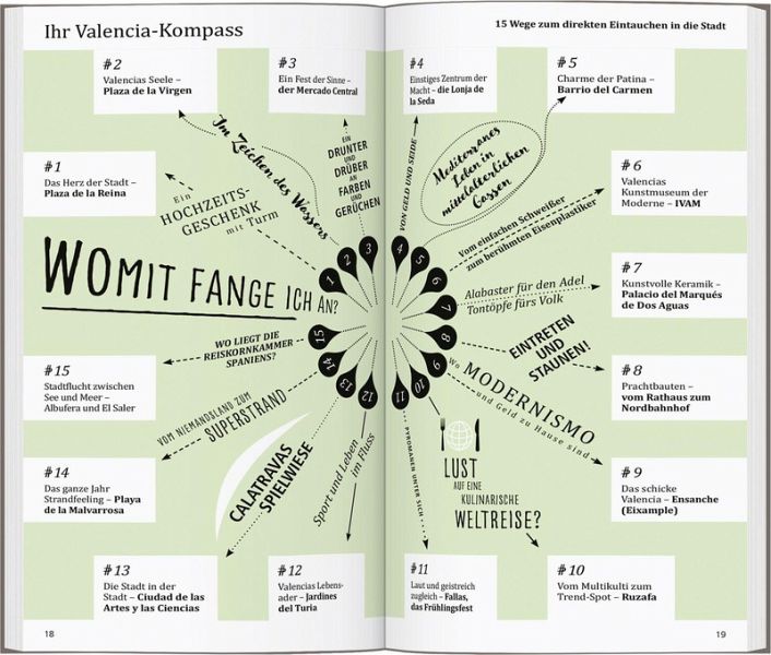 In eigenen Kapiteln erfahren Sie, wo es sich in fremden Betten gut schläft, wo Sie glücklich satt werden, wohin die Valencianos zum Stöbern und Entdecken gehen und wohin es sie zieht, wenn die Nacht beginnt.