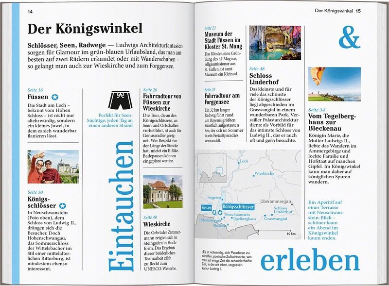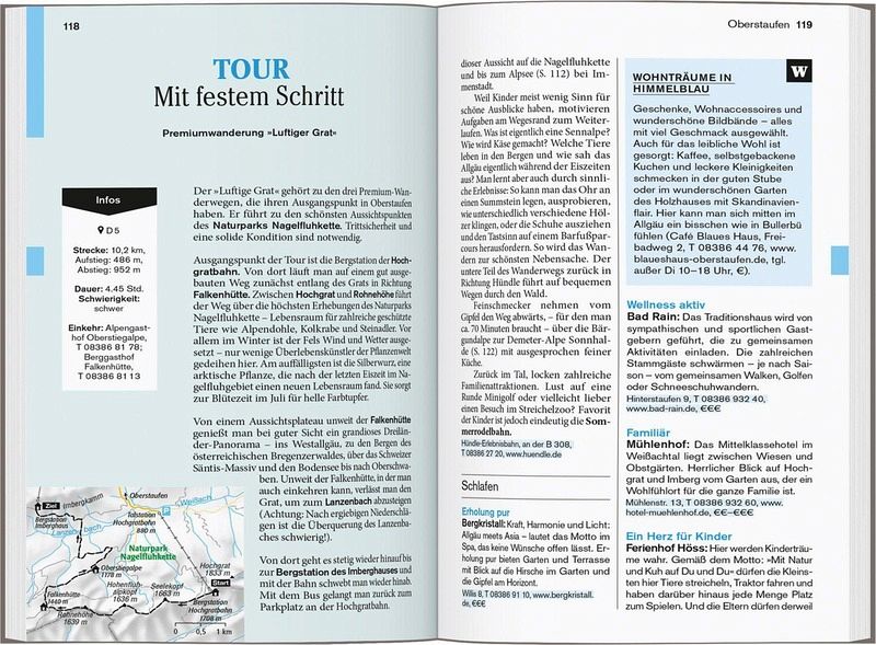 Persönlich und echt: Wir legen Wert auf ehrliche Erlebnisse, Nähe und Gegenwart Übersichtliche Gliederung in einzelne Regionen mit ihren Orten und Landschaften Lustvolle Eintauchen-und-erleben-Seiten vor jedem Kapitel Die Touren: Einfach losziehen, neue Wege gehen. Aktiv in Natur und Kultur eintauchen Die Lieblingsorte: gut für überraschende Entdeckungen Die Adressen: bewusst subjektive Auswahl, mal stylish, mal ökologisch, immer individuell und persönlich Das Magazin: Ein abwechslungsreiches Panorama porträtiert das Reiseziel Die Karten: 6 Citypläne, 17 Tourenkarten, Übersichtskarte mit den Highlights des Allgäus, Schnellüberblick zu jeder Region plus eine große Reisekarte