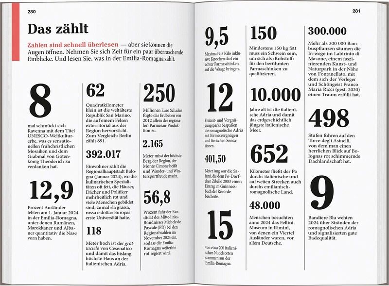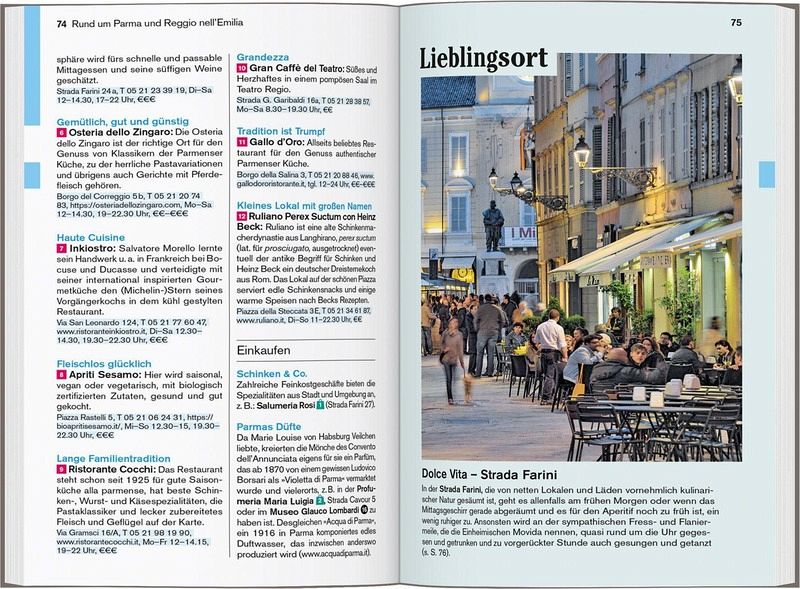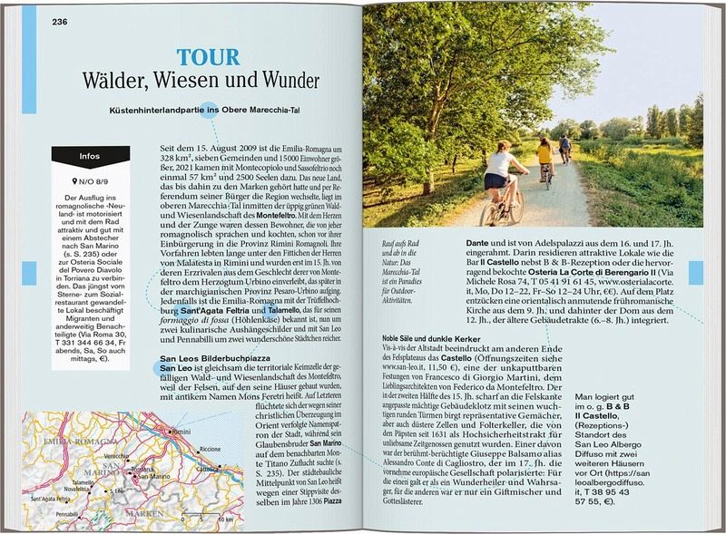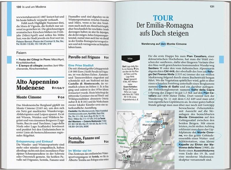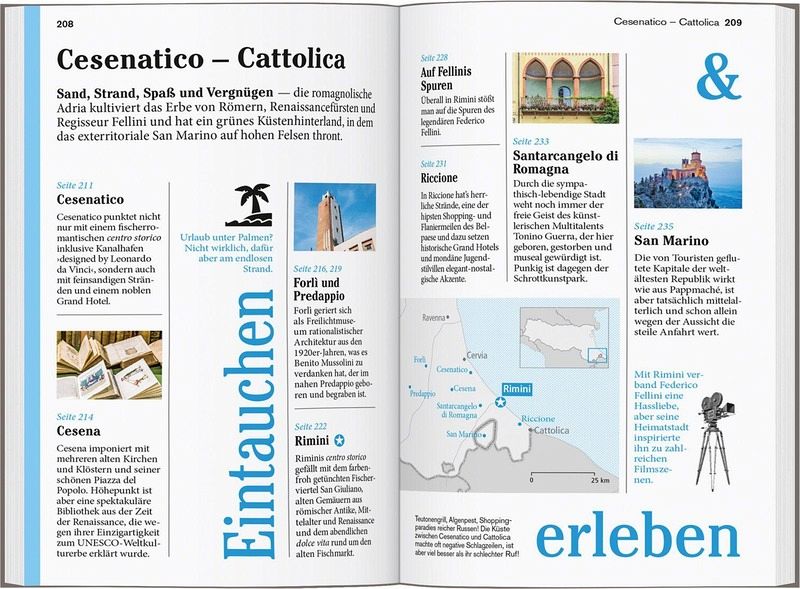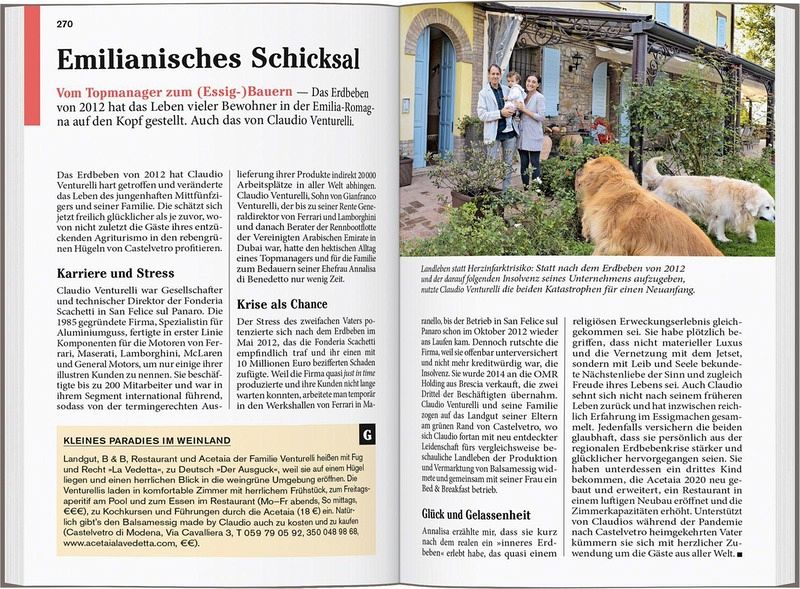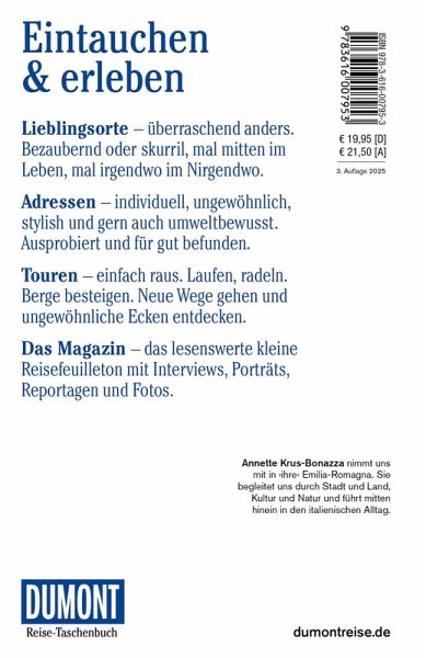 Persönlich und echt: Wir legen Wert auf ehrliche Erlebnisse, Nähe und Gegenwart Übersichtliche Gliederung in einzelne Regionen mit ihren Orten und Landschaften Die Touren: Einfach losziehen, neue Wege gehen. Aktiv in Natur und Kultur eintauchen Lustvolle Eintauchen-und-erleben-Seiten vor jedem Kapitel Die Lieblingsorte: gut für überraschende Entdeckungen Die Adressen: radikal subjektive Auswahl, mal stylish, mal ökologisch, immer individuell und persönlich Das Magazin: ein abwechslungsreiches Reisefeuilleton. Es packt auch kritische und kontroverse Themen an ... Die Karten: 8 Citypläne, 14 Tourenkarten, Übersichtskarte mit den Highlights der Emilia-Romagna, Schnellüberblick zu jeder Region plus eine große Reisekarte