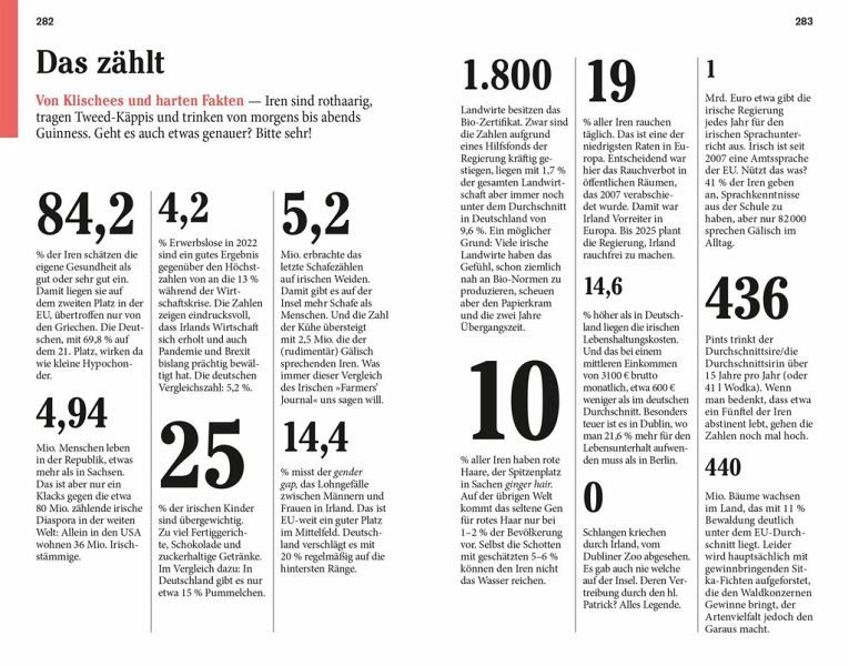 Mit ihrer großen Vielfalt hat die Republik Irland schon unzählige Traveller begeistert. Finden auch Sie 'Ihr' Irland und lassen sich dabei von den Lieblingsorten und Touren der Autorin Susanne Tschirner inspirieren. Outdoor-Erlebnisse warten überall auf der Insel: Wasserwanderer lassen sich über Seen oder den Fjord Killary Harbour treiben. 'Landverbundene' ziehen per pedes oder Mountainbike los zu sanften Hügeln, der bizarren Karstwelt des Burren und an den Wild Atlantic Way mit imposanten Panorama-Steilküsten, traumhaften Buchten und einsamen Mooren. Berauschend sind auch die urigen Pubs, in denen oft Folk-Musiker aufspielen. Machte dieser Mix aus Gerstensaft und Geselligkeit die Iren zu so guten Erzählern? Gehen Sie dem beim Kneipen-Klön oder auf den Spuren von Joyce, Yeats und Behan nach. Noch mehr Geschichten ranken sich um die Abteien, Burgen, Herrenhäuser, Megalithgräber und Hochkreuze. Und wenn Sie die Natur satt haben, tauchen Sie ein in das urbane Leben von Dublin, Cork und Galway, wo Partygänger, Gourmets und Shopper den Puls der Zeit spüren.
