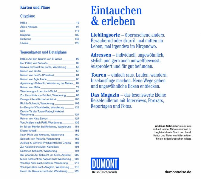 Die griechische Großinsel Kreta vereint dauerhafte Sonne, lange Strände, türkisblaues Meer, alpine Gebirge mit dramatischen Schluchten und wilden Waldgebieten, dazu quirlige Urlaubsorte und hübsche historische Städte aus der venezianischen und osmanischen Epoche. Auch für die neue Auflage 2024 ist Andreas Schneider wieder kreuz und quer über die Insel gefahren und hat neue reizvolle Ziele entdeckt: urige Dorftavernen und Ferienhäuschen im ruhigen Hinterland abseits jeder Hektik. Als Reiseleiter und Wanderführer präsentiert er auch neue Wanderungen und führt kenntnisreich zu den einzigartigen Ruinen der minoischen Hochkultur, aber auch durch das neue, spektakuläre Museum in Chaniá. Dieser umfassend aktualisierte Führer erschließt die unbekannten Gebirgsdörfer, präsentiert das wahre, authentische Gesicht der Insel als Reich der Schafe, Ziegen und knorrigen Ölbäume. Mit seinem Buch erleben Wanderer nicht nur die berühmte Samariá-Schlucht, sondern auch einsame Strecken auf alten Maultierpfaden zu Dorftavernen mit Musik und Tanz. Ausgehend von den Urlaubsorten der Nordküste und auch von kleinen Orten im Süden gibt es viel zu entdecken - Andreas Schneider kennt aus langer Erfahrung alles und zeigt es Ihnen verlässlich und informativ.