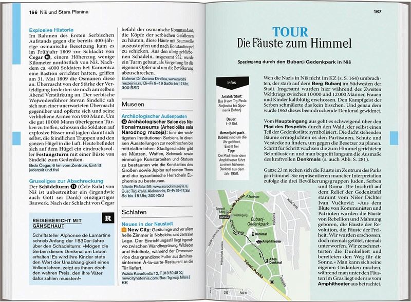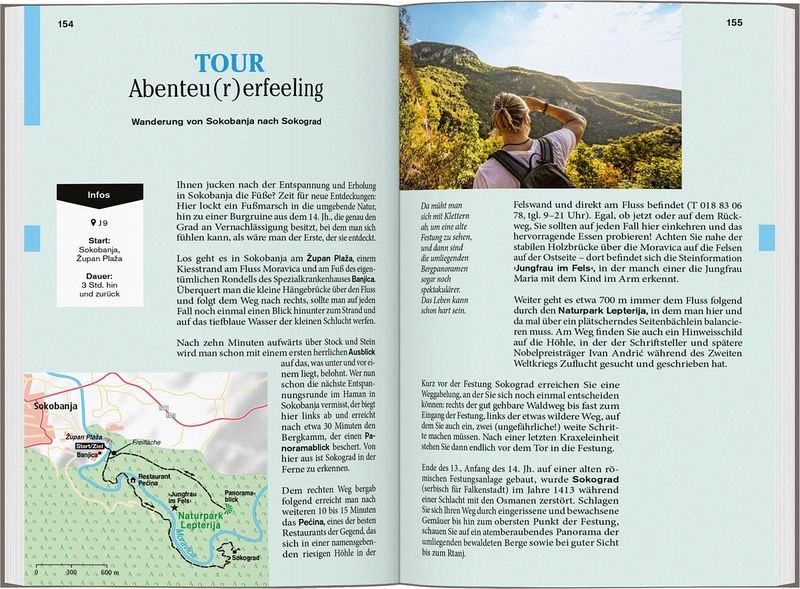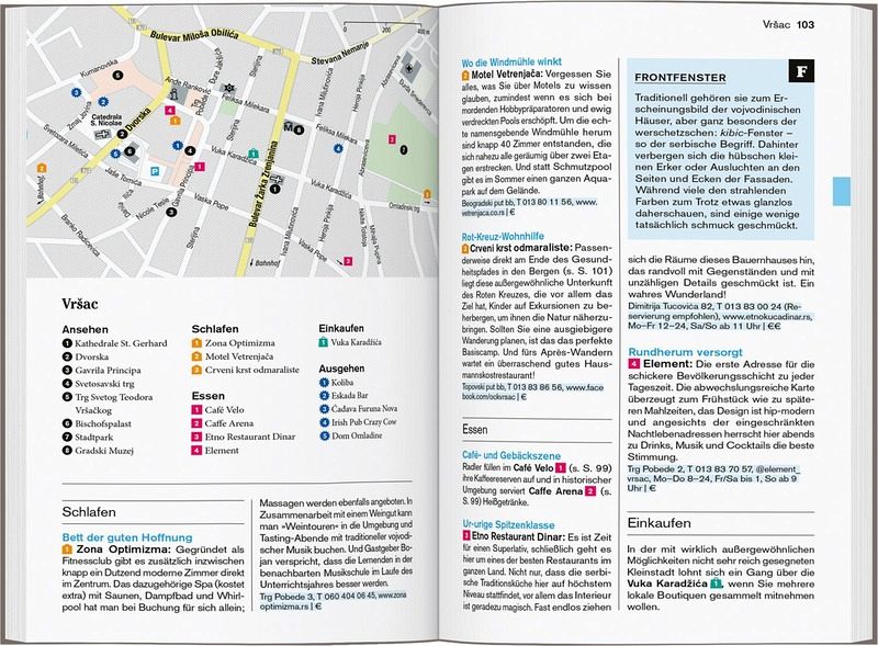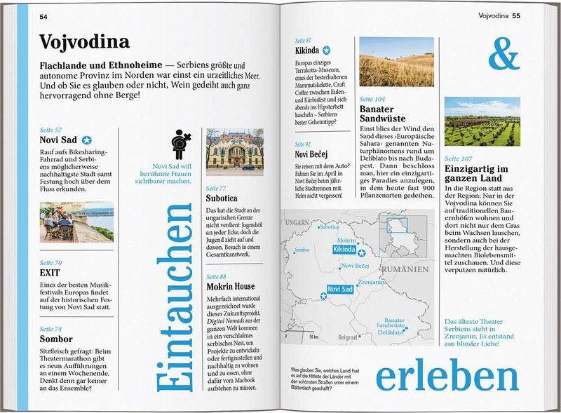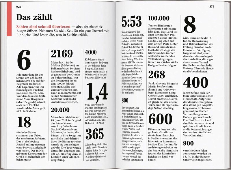 Persönlich und echt: Wir legen Wert auf ehrliche Erlebnisse, Nähe und Gegenwart Übersichtliche Gliederung in einzelne Regionen mit ihren Orten und Landschaften Lustvolle Eintauchen-und-erleben-Seiten vor jedem Kapitel Die Touren: Einfach losziehen, neue Wege gehen. Aktiv in Natur und Kultur eintauchen Die Lieblingsorte: gut für überraschende Entdeckungen Die Adressen: radikal subjektive Auswahl, mal stylish, mal ökologisch, immer individuell und persönlich Das Magazin: ein abwechslungsreiches Reisefeuilleton. Es packt auch kritische und kontroverse Themen an ... Die Karten: 8 Citypläne, 15 Tourenkarten, Übersichtskarte mit den Highlights Serbiens, Schnellüberblick zu jeder Region plus eine große Reisekarte