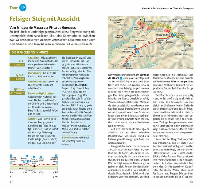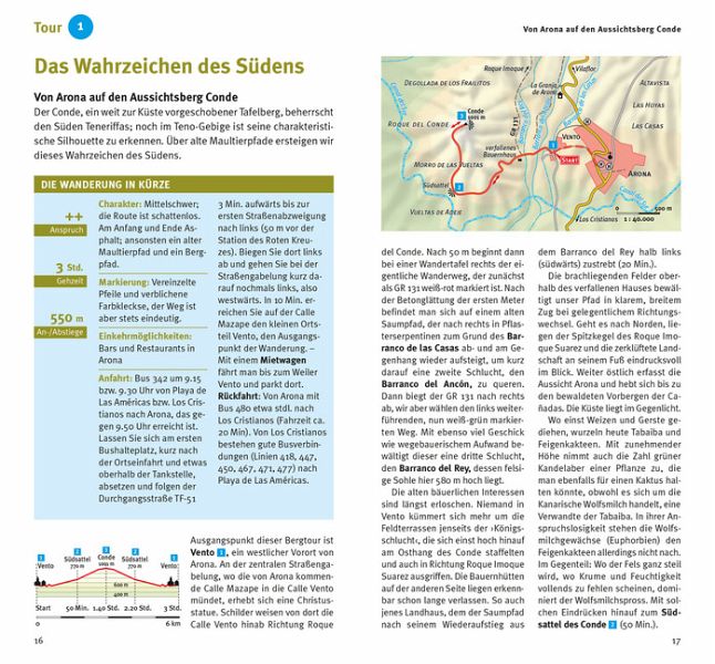 Herrliche Gipfeltouren, Panoramawege und Wanderungen hoch über dem Atlantischen Ozean erwarten Sie auf Teneriffa, der kanarischen Vulkaninsel mit Spaniens höchstem Gipfel, dem 3718 Meter hohen Pico del Teide. Jede der 35 Touren ermöglicht einen perfekten Wandertag, z. B. durch einen wildromantischen Barranco, entlang der Caldera- Randberge, auf den heiligen Fels der Guanchen oder auf den höchsten Gipfel Spaniens, den Teide: Exakte Wegbeschreibung, Karte und Höhenprofil sind jeweils durch die zugeordneten Wegpunkte eng aufeinander abgestimmt und machen die Orientierung einfach. Konkrete Angaben zu Dauer, Länge und Schwierigkeitsgrad, zu Anfahrtswegen und Einkehrmöglichkeiten erleichtern die Planung. Praktische Wandertipps und ein kurzer Magazinteil stimmen auf die Region ein. Susanne Lipps macht bei jeder Wanderung auf Sehenswertes am Wegesrand aufmerksam, sie gibt Tipps für besondere Pausenorte und Abstecher. Mit Überblickskarte und Register ist jeder Ort und jede Tour schnell gefunden.