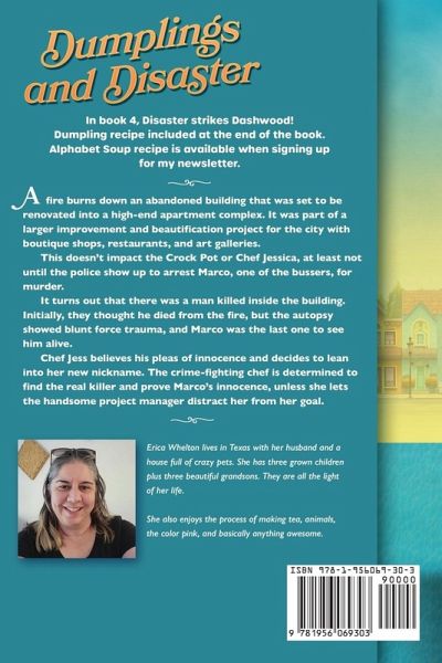 In book 4, Disaster strikes Dashwood! Dumpling recipe included at the end of the book. Alphabet Soup recipe is available when signing up for my newsletter. A fire burns down an abandoned building that was set to be renovated into a high-end apartment complex. It was part of a larger improvement and beautification project for the city with boutique shops, restaurants, and art galleries. This doesn't impact the Crock Pot or Chef Jessica, at least not until the police show up to arrest Marco, one of the bussers, for murder. It turns out that there was a man killed inside the building. Initially, they thought he died from the fire, but the autopsy showed blunt force trauma, and Marco was the last one to see him alive. Chef Jess believes his pleas of innocence and decides to lean into her new nickname. The crime-fighting chef is determined to find the real killer and prove Marco's innocence, unless she lets the handsome project manager distract her from her goal.