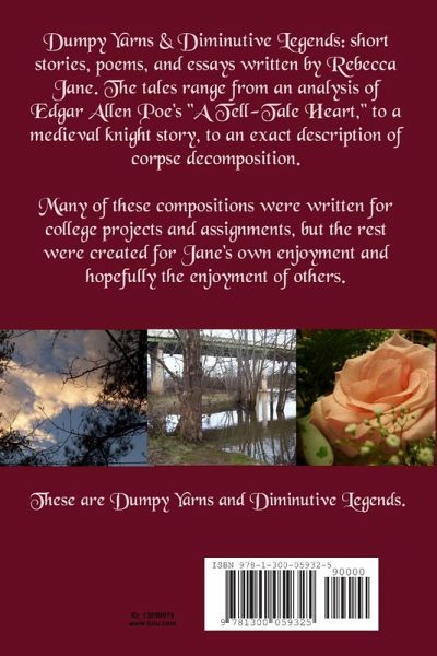 Dumpy Yarns & Diminutive Legends: short stories, poems, and essays written by Rebecca Jane. The tales range from an analysis of Edgar Allan Poe's "A Tell-Tale Heart," to a medieval knight story, to an exact description of corpse decomposition. Many of these compositions were written for college projects and assignments, but the rest were created for Jane's own enjoyment and hopefully the enjoyment of others. These are Dumpy Yarns and Diminutive Legends.