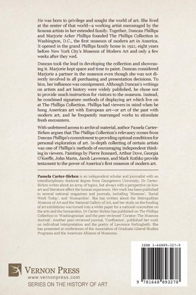 He was born to privilege and sought the world of art. She lived at the center of that world-a working artist encouraged by the famous artists in her extended family. Together, Duncan Phillips and Marjorie Acker Phillips founded The Phillips Collection in Washington, D.C., the first museum of modern art in America. It opened in the grand Phillips family home in 1921, eight years before New York City's Museum of Modern Art and only a few weeks after they wed. Duncan took the lead in developing the collection and showcasing it. Marjorie kept space and time to paint. Duncan considered Marjorie a partner in the museum even though she was not directly involved in all purchasing and presentation decisions. To him, her influence was omnipresent. Although Duncan's writings on artists and art history were widely published, he chose not to provide much instruction for visitors to the museum. Instead, he combined signature methods of displaying art which live on at The Phillips Collection. Phillips had viewers in mind when he hung American art with European art-or art of the past with modern art, and he frequently rearranged works to stimulate fresh encounters. With unfettered access to archival material, author Pamela Carter-Birken argues that The Phillips Collection's relevancy comes from Duncan Phillips's commitment to providing optimal conditions for personal exploration of art. In-depth collecting of certain artists was one of Phillips's methods of encouraging independent thinking in viewers. Paintings by Pierre Bonnard, Arthur Dove, Georgia O'Keeffe, John Marin, Jacob Lawrence, and Mark Rothko provide testament to the power of America's first museum of modern art.
