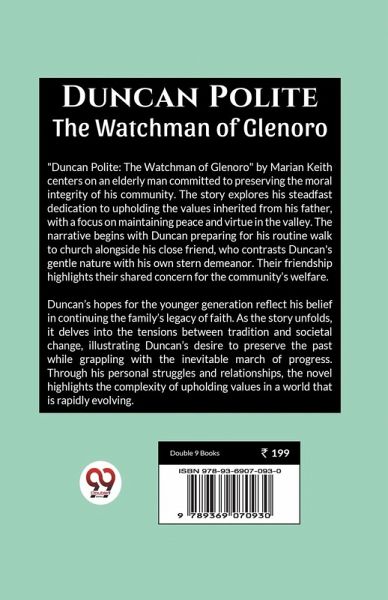 "Duncan Polite: The Watchman of Glenoro" by Marian Keith centers on an elderly man committed to preserving the moral integrity of his community. The story explores his steadfast dedication to upholding the values inherited from his father, with a focus on maintaining peace and virtue in the valley. The narrative begins with Duncan preparing for his routine walk to church alongside his close friend, who contrasts Duncan's gentle nature with his own stern demeanor. Their friendship highlights their shared concern for the community s welfare. Duncan s hopes for the younger generation reflect his belief in continuing the family s legacy of faith. As the story unfolds, it delves into the tensions between tradition and societal change, illustrating Duncan s desire to preserve the past while grappling with the inevitable march of progress. Through his personal struggles and relationships, the novel highlights the complexity of upholding values in a world that is rapidly evolving.