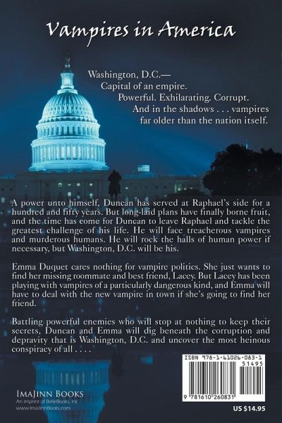 Washington, D.C.—capital of an empire. Powerful. Exhilarating. Corrupt. And in the shadows . . . vampires far older than the nation itself. A power unto himself, Duncan has served at Raphael’s side for a hundred and fifty years. But long-laid plans have finally borne fruit, and the time has come for Duncan to leave Raphael and tackle the greatest challenge of his life. He will face treacherous vampires and murderous humans. He will rock the halls of human power if necessary, but Washington, D.C. will be his. Emma Duquet cares nothing for vampire politics. She just wants to find her missing roommate and best friend, Lacey. But Lacey has been playing with vampires of a particularly dangerous kind, and Emma will have to deal with the new vampire in town if she’s going to find her friend. Battling powerful enemies who will stop at nothing to keep their secrets, Duncan and Emma will dig beneath the corruption and depravity that is Washington, D.C. and uncover the most heinous conspiracy of all . . .