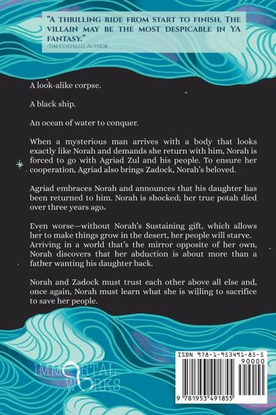A look-alike corpse. A black ship. An ocean of water to conquer. When a mysterious man arrives with a body that looks exactly like Norah and demands she return with him, Norah is forced to go with Agriad Zul and his people. To ensure her cooperation, Agriad also brings Zadock, Norah's beloved. Agriad embraces Norah and announces that his daughter has been returned to him. Norah is shocked; her true potah died over three years ago. Even worse-without Norah's Sustaining gift, which allows her to make things grow in the desert, her people will starve. Arriving in a world that's the mirror opposite of her own, Norah discovers that her abduction is about more than a father wanting his daughter back. Norah and Zadock must trust each other above all else and, once again, Norah must learn what she is willing to sacrifice to save her people.
