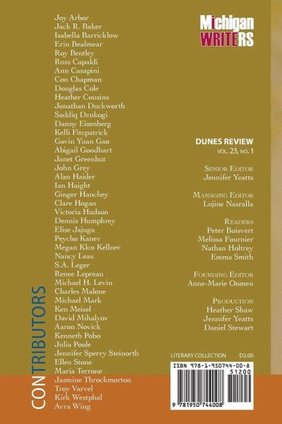 The Winter/Spring 2019 issue of Dunes Review, northern Michigan's leading independent literary journal. Dunes Review is published by Michigan Writers, Inc., based in Traverse City, Michigan.