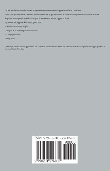 Un peu penché au fond de la tranchée, il regardait l'épaisse fumée qui s'échappait de la ville de Dunkerque. Il était clair que des combats sans merci se déroulaient là-bas, et que les hommes de la ville devaient passer un très mauvais moment. Regardant avec de grands yeux bleus le sergent, le plus jeune du peloton s'approcha de lui. Il y avait un ton suppliant dans sa voix quand il dit : « Aurons-nous le temps, sergent ? Le sergent ne se retourna pas, mais demanda : "Le temps pour quoi? "Pour y arriver ... Dunkerque est une histoire appartenant à la collection Seconde Guerre Mondiale, une série de romans de guerre développés pendant la Seconde Guerre Mondiale.
