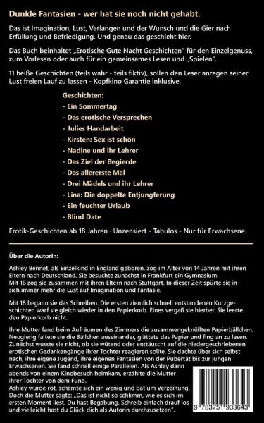 Ashley Bennet - als Einzelkind in England geboren - zog im Alter von 14 Jahren mit ihren Eltern nach Deutschland. Sie besuchte zunächst in Frankfurt ein Gymnasium. Mit 16 zog sie zusammen mit ihren Eltern nach Stuttgart. In dieser Zeit spürte sie in sich immer mehr die Lust auf Imagination und Fantasie. Mit 18 begann sie das Schreiben. Die ersten ziemlich schnell entstandenen Kurzgeschichten warf sie gleich wieder in den Papierkorb. Eines vergaß sie hierbei: Sie leerte den Papierkorb nicht. Es kam, was kommen musste. Ihre Mutter fand beim Aufräumen des Zimmers die zusammengeknüllten Papierbällchen. Neugierig faltete sie die Bällchen auseinander, glättete das Papier und fing an zu lesen. Zunächst wusste sie nicht, ob sie wütend oder enttäuscht auf die niedergeschriebenen erotischen Gedankengänge ihrer Tochter reagieren sollte. Sie dachte über sich selbst nach, ihre eigene Jugend, ihre eigenen Fantasien von der Pubertät bis zur jungen Erwachsenen. Sie fand schnell einige Parallelen. Als Ashley dann abends von einem Kinobesuch heimkam, erzählte die Mutter ihrer Tochter von dem Fund. Ashley wurde rot, schämte sich ein wenig und bat um Verzeihung. Doch die Mutter sagte: "Das ist nicht so schlimm, wie es sich im ersten Moment liest. Du hast Begabung. Schreib einfach drauf los und vielleicht hast du Glück dich als Autorin durchzusetzen". ...................................................... Eine Titelübersicht meiner Bücher und weitere Informationen findet ihr auf meinem Blog unter: https://ashleybennet.blogspot.com