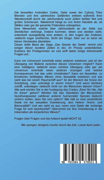 Die beseelten Androiden Celine, Dalia sowie der Cyborg Theo Menster und ihre zahlreichen Gefährten erleben während ihrer Wanderschaft durch die Jahrhunderte auch Zeiten tiefster Not und großer Schmerzen. Wiederholt hängt es von ihrem Handeln ab, ob Welten oder gar die gesamte Föderation untergehen.Eine Wesenheit, welche über Jahrhunderte an der Seite von Sterblichen verbringt, Andere kommen, leben und sterben sieht, entwickelt zwangsläufig eine andere, in den Augen der Anderen, vielleicht sogar unethische, Sicht der Dinge. Aber nur so kann sie klaren Verstandes überleben.Dieser dritte Band der Saga "Das Gesetz der Seele" nimmt sich einiger dieser dunklen Zeiten in der, im Prinzip unsterblichen, Existenz der Protagonisten an und wirft dabei einige interessante Fragen auf... Kann ein Universum innerhalb eines anderen existieren und ist der Übergang von Materie zwischen diesen Universen möglich? Kann eine Intelligenz vielleicht einen solchen Übergang oder gar ein Universum innerhalbeines anderen erzeugen und welche Konsequenzen hat das unter Umständen? Kann ein beseeltes, zu Emotionen befähigtes Wesen ohne Sexualität existieren und wie sieht das bei einem Raumschiff aus? Ist der Mensch die Krone der Schöpfung, oder unterliegt er einem Irrtum? Und wenn letzteres zutrifft, unterliegen vielleicht nicht nur die Menschen diesem Irrtum? Wie weit würden Sie in der Auslegung des Credos "Einer für Alle, Alle für Einen" gehen? Würden Sie das Überleben der Menschheit, beziehungsweise zahlloser anderer humanoider Spezies dadurch sichern wollen, dass Sie sich opfern? Wie hält es eine unsterbliche Seele mit der sexuellen Orientierung, also Hetero- Homo- und Bisexualität? Und wie sieht es aus, wenn eine Seele die vorherige Frage für sich beantwortet? Übernimmt sie ihre Orientierung in die Inkarnation als körperliches Wesen?Fragen über Fragen und die Antwort lautet NICHT 42.Wir springen übrigens munter durch die Zeit. Linear kann jeder...