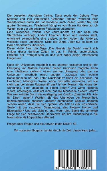 Die beseelten Androiden Celine, Dalia sowie der Cyborg Theo Menster und ihre zahlreichen Gefährten erleben während ihrer Wanderschaft durch die Jahrhunderte auch Zeiten tiefster Not und großer Schmerzen. Wiederholt hängt es von ihrem Handeln ab, ob Welten oder gar die gesamte Föderation untergehen.Eine Wesenheit, welche über Jahrhunderte an der Seite von Sterblichen verbringt, Andere kommen, leben und sterben sieht, entwickelt zwangsläufig eine andere, in den Augen der Anderen, vielleicht sogar unethische, Sicht der Dinge. Aber nur so kann sie klaren Verstandes überleben.Dieser dritte Band der Saga "Das Gesetz der Seele" nimmt sich einiger dieser dunklen Zeiten in der, im Prinzip unsterblichen, Existenz der Protagonisten an und wirft dabei einige interessante Fragen auf... Kann ein Universum innerhalb eines anderen existieren und ist der Übergang von Materie zwischen diesen Universen möglich? Kann eine Intelligenz vielleicht einen solchen Übergang oder gar ein Universum innerhalbeines anderen erzeugen und welche Konsequenzen hat das unter Umständen? Kann ein beseeltes, zu Emotionen befähigtes Wesen ohne Sexualität existieren und wie sieht das bei einem Raumschiff aus? Ist der Mensch die Krone der Schöpfung, oder unterliegt er einem Irrtum? Und wenn letzteres zutrifft, unterliegen vielleicht nicht nur die Menschen diesem Irrtum? Wie weit würden Sie in der Auslegung des Credos "Einer für Alle, Alle für Einen" gehen? Würden Sie das Überleben der Menschheit, beziehungsweise zahlloser anderer humanoider Spezies dadurch sichern wollen, dass Sie sich opfern? Wie hält es eine unsterbliche Seele mit der sexuellen Orientierung, also Hetero- Homo- und Bisexualität? Und wie sieht es aus, wenn eine Seele die vorherige Frage für sich beantwortet? Übernimmt sie ihre Orientierung in die Inkarnation als körperliches Wesen?Fragen über Fragen und die Antwort lautet NICHT 42.Wir springen übrigens munter durch die Zeit. Linear kann jeder...