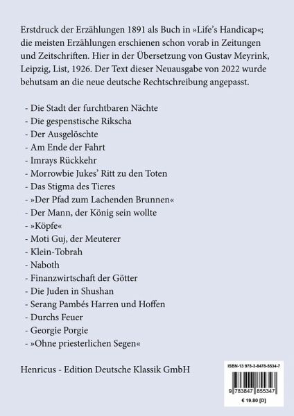 Rudyard Kipling: Dunkles IndienLesefreundlicher Großdruck in 16-pt-SchriftGroßformat, 210 x 297 mmBerliner Ausgabe, 2023Durchgesehener Neusatz bearbeitet und eingerichtet von Theodor BorkenErstdruck der Erzählungen als Buch in »Life's Handicap«, 1891, wobei die meisten Erzählungen schon in Zeitungen und Zeitschriften vorab erschienen. Hier in der Übersetzung von Gustav Meyrink, Leipzig, List, 1926.Inhaltsverzeichnis:Dunkles Indien.Vorwort.Die Stadt der furchtbaren Nächte.Die gespenstische Rikscha.Der Ausgelöschte.Am Ende der Fahrt.Imrays Rückkehr.Morrowbie Jukes' Ritt zu den Toten.Das Stigma des Tieres.»Der Pfad zum Lachenden Brunnen«.Der Mann, der König sein wollte.»Köpfe«.Moti Guj, der Meuterer.Klein-Tobrah.Naboth.Finanzwirtschaft der Götter.Die Juden in Shushan.Serang Pambés Harren und Hoffen.Durchs Feuer.Georgie Porgie.»Ohne priesterlichen Segen«.Der Text dieser Ausgabe wurde behutsam an die neue deutsche Rechtschreibung angepasst.Umschlagabbildung: Edwin Lord Weeks, Blau gekachelte Moschee außerhalb von Delhi, um 1885Gesetzt aus der Minion Pro, 16 pt.Henricus - Edition Deutsche Klassik GmbH