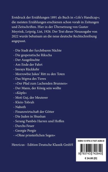 Rudyard Kipling: Dunkles IndienErstdruck der Erzählungen als Buch in »Life's Handicap«, 1891, wobei die meisten Erzählungen schon in Zeitungen und Zeitschriften vorab erschienen. Hier in der Übersetzung von Gustav Meyrink, Leipzig, List, 1926.Inhaltsverzeichnis:Vorwort.Die Stadt der furchtbaren Nächte.Die gespenstische Rikscha.Der Ausgelöschte.Am Ende der Fahrt.Imrays Rückkehr.Morrowbie Jukes' Ritt zu den Toten.Das Stigma des Tieres.»Der Pfad zum Lachenden Brunnen«.Der Mann, der König sein wollte.»Köpfe«.Moti Guj, der Meuterer.Klein-Tobrah.Naboth.Finanzwirtschaft der Götter.Die Juden in Shushan.Serang Pambés Harren und Hoffen.Durchs Feuer.Georgie Porgie.»Ohne priesterlichen Segen«.Neuausgabe, herausgegeben von Karl-Maria Guth, Berlin 2023.Der Text dieser Ausgabe wurde behutsam an die neue deutsche Rechtschreibung angepasst.Umschlagabbildung: Edwin Lord Weeks, Blau gekachelte Moschee außerhalb von Delhi, um 1885Gesetzt aus der Minion Pro, 11 pt.Die Sammlung Hofenberg erscheint im Verlag Henricus - Edition Deutsche Klassik GmbH, Berlin