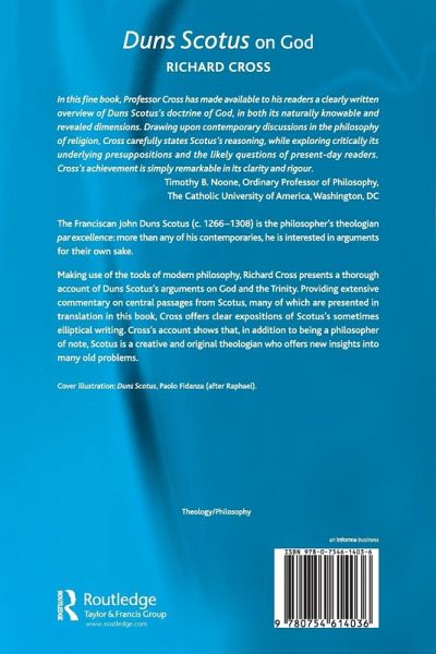 The Franciscan John Duns Scotus (c. 1266-1308) is the philosopher's theologian par excellence: more than any of his contemporaries, he is interested in arguments for their own sake. Making use of the tools of modern philosophy, Richard Cross presents a thorough account of Duns Scotus's arguments on God and the Trinity. Providing extensive commentary on central passages from Scotus, many of which are presented in translation in this book, Cross offers clear expositions of Scotus's sometimes elliptical writing. Cross's account shows that, in addition to being a philosopher of note, Scotus is a creative and original theologian who offers new insights into many old problems.