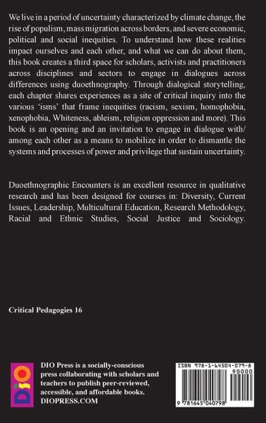 We live in a period of uncertainty characterized by climate change, the rise of populism, mass migration across borders, and severe economic, political and social inequities. To understand how these realities impact ourselves and each other, and what we can do about them, this book will create a "third space" for scholars, activists and practitioners across disciplines and sectors to engage in dialogues across differences using duoethnography (Norris & Sawyer, 2012). Through dialogical storytelling, each chapter shares experiences as a site of critical inquiry into the various 'isms' that frame inequities (racism, sexism, homophobia, xenophobia, Whiteness, ableism, religion oppression and more). This book is an opening and an invitation to engage in dialogue with/among each other as a means to mobilize in order to dismantle the systems and processes of power and privilege that sustain uncertainty. Courses: Diversity courses; research methodology (duoethnography); racial and ethnic studies; multicultural education; sociology; leadership and diversity; cross-disciplinary courses on current issues and social justice.