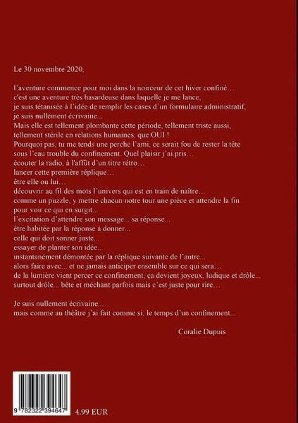 Le 30 novembre 2020, l'aventure commence pour moi dans la noirceur de cet hiver confiné. C'est une aventure très hasardeuse dans laquelle je me lance, je suis tétanisée à l'idée de remplir les cases d'un formulaire administratif, je suis nullement écrivaine. Mais elle est tellement plombante cette période, tellement triste aussi, tellement stérile en relations humaines, que OUI ! Pourquoi pas ! Tu me tends une perche l'ami, ce serait fou de rester la tête sous l'eau trouble du confinement. Quel plaisir j'ai pris... écouter la radio, à l'affut d'un titre rétro... lancer cette première réplique... être lui ou elle... découvrir au fil des mots l'univers qui est en train de naître, comme un puzzle, y mettre chacun notre tour une pièce et attendre la fin pour voir ce qui en surgit... l'excitation d'attendre son message, sa réponse... être habitée par la réponse à donner, celle qui doit sonner juste, essayer de planter son idée, instantanément démontée par la réplique suivante... alors faire avec, et ne jamais anticiper ensemble sur ce qui sera...De la lumière vient percer ce confinement, ça devient joyeux, ludique et drôle... surtout drôle... bête et méchant parfois mais c'est juste pour rire...je suis nullement écrivaine... mais comme au théâtre, j'ai fait comme si, le temps d'un confinement.