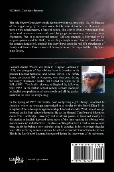 The title Duppy Conqueror should resonate with most Jamaicans. No, not because of the reggae song by the same name, but because it has been a title conferred upon a very tough person, a force of nature. The story is about a young man born in the mid nineteen sixties, confronted by gangs, the rude boys, and other more frightening foes of a paranormal nature. Williams strength is informed by his religious parents and the Bible; but are they enough to keep him safe and alive in the concrete jungles of Jamaica? The story draws upon the real-life experiences of family and friends. This is a work of fiction; however, the impact of the Holy Spirit is no fiction.