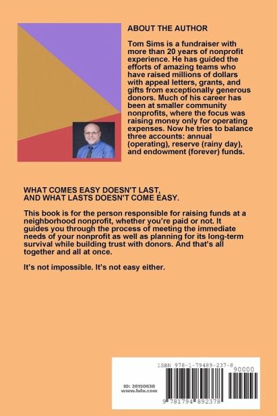 What comes easy doesn't last, and what lasts doesn't come easy. This book is for the person responsible for raising funds at a neighborhood nonprofit, whether you're paid or not. It guides you through the process of meeting the immediate needs of your nonprofit as well as planning for its long-term survival while building trust with donors. And that's all together and all at once. It's not impossible. It's not easy either.