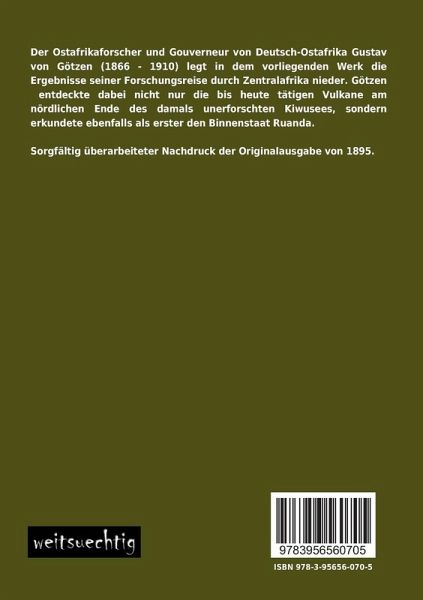 Der Ostafrikaforscher und Gouverneur von Deutsch-Ostafrika Gustav von Götzen (1866 - 1910) legt in dem vorliegenden Werk die Ergebnisse seiner Forschungsreise durch Zentralafrika nieder. Götzen entdeckte dabei nicht nur die bis heute tätigen Vulkane am nördlichen Ende des damals unerforschten Kiwusees, sondern erkundete ebenfalls als erster den Binnenstaat Ruanda.