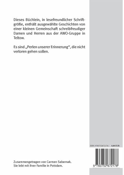 Dieses Büchlein, in lesefreundlicher Schriftgröße, enthält Geschichten und Gedichte einer kleinen Gemeinschaft schreibfreudiger Damen aus der AWO-Gruppe in Teltow.Es sind "Perlen unserer Erinnerung", die nicht verloren gehen sollen.