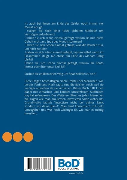 Ist auch bei Ihnen am Ende des Geldes noch immer viel Monat übrig? Suchen Sie nach einer 100% sicheren Methode um Vermögen aufzubauen? Haben sie sich schon einmal gefragt, warum sie mit ihrem Gehalt nicht ans Ende des Monats kommen? Haben sie sich schon einmal gefragt, was die Reichen tun, um reich zu sein? Haben sie sich schon einmal gefragt, warum selbst wenn ihr Einkommen steigt, nie etwas am Ende des Monats übrig bleibt? Haben sie sich schon einmal gefragt, warum ihr Konto immer oder öfter unter Null ist? Suchen Sie endlich einen Weg um finanziell frei zu sein? Diese Fragen beschäftigen einen Großteil der Menschen. Wie bereits Ferdinand Piech sagte sind die Reichen reich weil sie weniger ausgeben als sie verdienen. Dieses Buch hilft Ihnen dabei mit einfachen und konkret umsetzbaren Methoden Kapital aufzubauen. Des Weiteren öffnet es jeden Menschen die Augen wie man am Besten investieren sollte wobei das Grundmotto lautet: "Investiere nicht bei deiner Bank, sondern wie deine Bank!". Man lernt konsequent mit Geld umzugehen und was noch wichtiger ist, wie man es richtig investiert.
