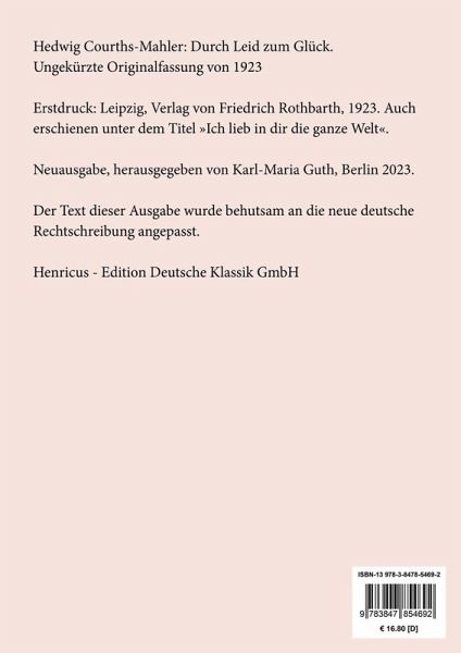 Hedwig Courths-Mahler: Durch Leid zum Glück. Ungekürzte Originalfassung von 1923Lesefreundlicher Großdruck in 16-pt-SchriftGroßformat, 210 x 297 mmBerliner Ausgabe, 2023Durchgesehener Neusatz bearbeitet und eingerichtet von Theodor BorkenErstdruck: Leipzig, Verlag von Friedrich Rothbarth, 1923. Auch erschienen unter dem Titel »Ich lieb in dir die ganze Welt«.Der Text dieser Ausgabe wurde behutsam an die neue deutsche Rechtschreibung angepasst.Umschlagabbildung: Childe Hassam, Der viktorianische Stuhl, 1906Gesetzt aus der Minion Pro, 16 pt.Henricus - Edition Deutsche Klassik GmbH