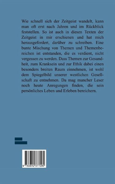 Wie schnell sich der Zeitgeist wandelt, kann man oft erst nach Jahren und im Rückblick feststellen. So ist auch in diesen Texten der Zeitgeist in mir erschienen und hat mich herausgefordert, darüber zu schreiben. Eine bunte Mischung von Themen und Themenbereichen ist entstanden, die es verdient, nicht vergessen zu werden. Dass Themen zur Gesundheit, zum Kranksein und zur Ethik dabei einen besonders breiten Raum einnehmen, ist wohl dem Spiegelbild unserer westlichen Gesellschaft zu entnehmen. Da mag mancher Leser noch heute Anregungen finden, die sein persönliches Leben und Erleben bereichern. Doch auch im Grundsätzlichen bewegen wir uns gerne, und wenn wir uns dabei ins Zeitlose verirren, mag es ein Zeichen der Zeitlosigkeit sein, die solchem Bemühen anhaftet. Durch meine Brille gesehen, im Spiegel des Zeitgeistes betrachtet: Die Texte führen uns gemeinsam in die Gegenwart, auch wenn wir sie heute anders erleben als vor Jahren.