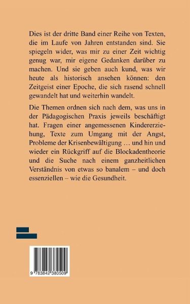 Dies ist der dritte Band einer Reihe von Texten, die im Laufe von Jahren entstanden sind. Sie spiegeln wider, was mir zu einer Zeit wichtig genug war, mir eigene Gedanken darüber zu machen. Und sie geben auch kund, was wir heute als historisch ansehen können: den Zeitgeist einer Epoche, die sich rasend schnell gewandelt hat und weiterhin wandelt. Die Themen ordnen sich nach dem, was uns in der Pädagogischen Praxis jeweils beschäftigt hat. Fragen einer angemessenen Kindererziehung, Texte zum Umgang mit der Angst, Probleme der Krisenbewältigung ... und hin und wieder ein Rückgriff auf die Blockadentheorie und die Suche nach einem ganzheitlichen Verständnis von etwas so banalem - und doch essenziellen - wie die Gesundheit.