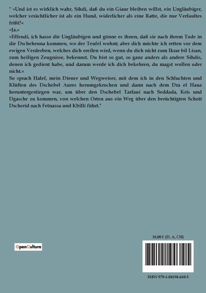 " »Und ist es wirklich wahr, Sihdi, daß du ein Giaur bleiben willst, ein Ungläubiger, welcher verächtlicher ist als ein Hund, widerlicher als eine Ratte, die nur Verfaultes frißt?« »Ja.« »Effendi, ich hasse die Ungläubigen und gönne es ihnen, daß sie nach ihrem Tode in die Dschehenna kommen, wo der Teufel wohnt; aber dich möchte ich retten vor dem ewigen Verderben, welches dich ereilen wird, wenn du dich nicht zum Ikrar bil Lisan, zum heiligen Zeugnisse, bekennst. Du bist so gut, so ganz anders als andere Sihdis, denen ich gedient habe, und darum werde ich dich bekehren, du magst wollen oder nicht.« So sprach Halef, mein Diener und Wegweiser, mit dem ich in den Schluchten und Klüften des Dschebel Aures herumgekrochen und dann nach dem Dra el Haua heruntergestiegen war, um über den Dschebel Tarfaui nach Seddada, Kris und Dgasche zu kommen, von welchen Orten aus ein Weg über den berüchtigten Schott Dscherid nach Fetnassa und Kbilli führt."