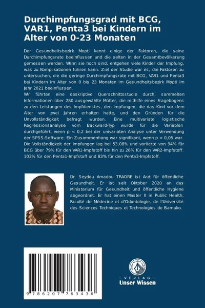 Der Gesundheitsbezirk Mopti kennt einige der Faktoren, die seine Durchimpfungsrate beeinflussen und die selten in der Gesamtbevölkerung gemessen werden. Wenn sie hoch sind, entgehen viele Kinder der Impfung, was zu Komplikationen führen kann. Ziel der Studie war es, die Faktoren zu untersuchen, die die geringe Durchimpfungsrate mit BCG, VAR1 und Penta3 bei Kindern im Alter von 0 bis 23 Monaten im Gesundheitsbezirk Mopti im Jahr 2021 beeinflussen.Wir führten eine deskriptive Querschnittsstudie durch, sammelten Informationen über 280 ausgewählte Mütter, die mithilfe eines Fragebogens zu den Leistungen des Impfdienstes, den Impfungen, die das Kind vor dem Alter von zwei Jahren erhalten hatte, und den Gründen für die Unvollständigkeit befragt wurden. Eine multivariate logistische Regressionsanalyse vom Backward-Typ wurde für die Variablen durchgeführt, wenn p < 0,2 bei der univariaten Analyse unter Verwendung der SPSS-Software. Ein Zusammenhang war signifikant, wenn p < 0,05 war.Die Vollständigkeit der Impfungen lag bei 53,08% und variierte von 94% für BCG über 79% für den VAR1-Impfstoff bis hin zu 26% für den VAR2-Impfstoff. 103% für den Penta1-Impfstoff und 83% für den Penta3-Impfstoff.
