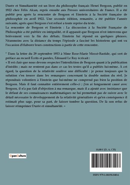 Durée et Simultanéité est un livre du philosophe français Henri Bergson, publié en 1922 chez Félix Alcan, repris ensuite aux Presses universitaires de France. Il a été publié peu après la rencontre de Bergson et Einstein à la Société française de philosophie en avril 1922. Une seconde édition, remaniée, a été publiée l'année suivante, après quoi Bergson s'est refusé a toute reprise du texte. La rencontre de Bergson et Einstein : La discussion à la Société Française de Philosophie a été publiée en intégralité, et il apparaît que Bergson n'est intervenu que brièvement vers la fin des débats. Einstein lui répond en quelques phrases. Néanmoins avec la distance du temps l'épisode a fasciné les historiens qui ont vu l'occasion d'élaborer leurs constructions à partir de cette rencontre. " Dans la lettre du 29 septembre 1953 à Mme Rose-Marie Mossé-Bastide, qui sert de préface au recueil Écrits et paroles, Édouard Le Roy écrivait : « Il est clair que nous devons respecter l'interdiction de Bergson quant à la publication d'inédits ; mais ne rentrent pas dans ce cas les textes qu'il a publiés lui-même. À cet égard, la question de la relativité soulève une difficulté : je pense toujours que la solution s'en trouve dans les remarques concernant la double notion du réel. Je répondrais volontiers à Einstein que lui-même ne comprend pas bien la position de Bergson. Mais il faut connaître entièrement celle-ci ; j'en ai longuement causé avec Bergson, il n'a pas fait d'objection à ma remarque, mais il a ajouté avec insistance que le défaut de ses connaissances mathématiques ne lui permettait pas de suivre avec le détail nécessaire le développement de la relativité généralisée et qu'en conséquence il estimait plus sage, pour sa part, de laisser tomber la question. De là son refus de laisser réimprimer Durée et simultanéité. »