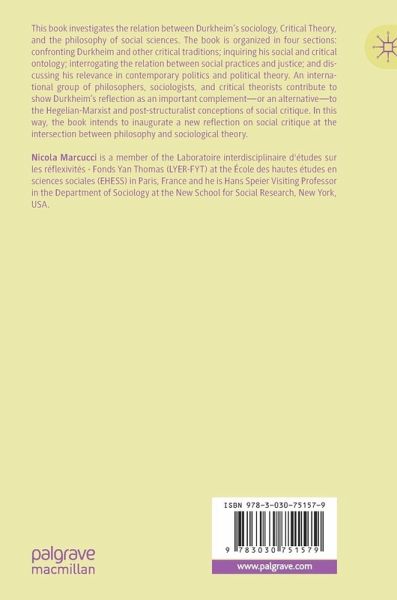 This book investigates the relation between Durkheim's sociology, Critical Theory, and the philosophy of social sciences. The book is organized in four sections: confronting Durkheim and other critical traditions; inquiring his social and critical ontology; interrogating the relation between social practices and justice; and discussing his relevance in contemporary politics and political theory. An international group of philosophers, sociologists, and critical theorists contribute to show Durkheim's reflection as an important complement-or an alternative-to the Hegelian-Marxist and post-structuralist conceptions of social critique. In this way, the book intends to inaugurate a new reflection on social critique at the intersection between philosophy and sociological theory.