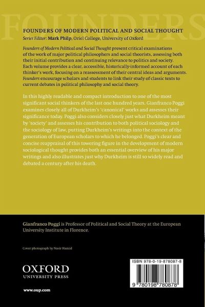 In this highly readable and compact introduction to Durkheim's thought, Gianfranco Poggi examines all of Durkheim's central works and assesses their significance today, a century after his death. Poggi's analyses includes a study of what Durkheim meant by 'society' and an evaluation of Durkheim's contributions to both political sociology and the sociology of law. Poggi's clear and concise reappraisal of one of the most important modern thinkers will be essential reading for students of sociology and an invaluable guide for anyone studying the ways modern societies function.