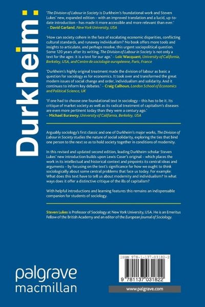Arguably sociology's first classic and one of Durkheim's major works, The Division of Labour in Society studies the nature of social solidarity, exploring the ties that bind one person to the next so as to hold society together in conditions of modernity. In this revised and updated second edition, leading Durkheim scholar Steven Lukes' new introduction builds upon Lewis Coser's original - which places the work in its intellectual and historical context and pinpoints its central ideas and arguments - by focusing on the text's significance for how we ought to think sociologically about some central problems that face us today. For example: What does this text have to tell us about modernity and individualism? In what ways does it offer a distinctive critique of the ills of capitalism? With helpful introductions and learning features this remains an indispensable companion for students of sociology.