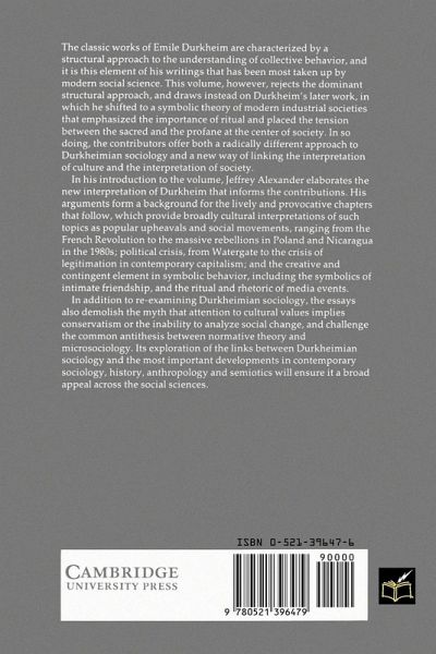 Acknowledgements; Introduction: Durkheimian sociology and cultural studies today Jeffrey C. Alexander; Part I. Social Change and Saralization: 1. The sacred and the French Revolution Lynn Hunt; 2. From Durkheim to Managua: revolutions as religious revivals Edward A. Tiryakian; 3. The Liminal fight: mass strikes as ritual and interpretation Eric W. Rothenbuhler; Part II. Micro and Macro in Symbolic Context: 4. Religious elements in friendship: Durkheimian theory in an empirical context Ruth A. Wallace and Shirley F. Hartley; 5. The Durkheimian tradition in conflict sociology Randall Collins; 6. Social structure and civil religion: legitimation crisis in a late Durkheimian perspective Hans-Peter Müller; Part III. Ritualization and Public Life: 7. Articulating consenus: the ritual and rhetoric of media events Daniel Dayan and Elihu Katz; 8. Culture and political crisis: 'Watergate' and Durkheimian sociology Jeffrey C. Alexander; Index.