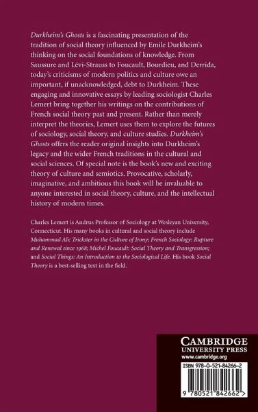 Durkheim's Ghosts is a fascinating presentation of the tradition of social theory influenced by Emile Durkheim's thinking on the social foundations of knowledge. From Saussure and Levi-Strauss to Foucault, Bourdieu and Derrida, today's criticisms of modern politics and culture owe an important, if unacknowledged, debt to Durkheim. These engaging and innovative essays by leading sociologist Charles Lemert bring together his writings on the contributions of French social theory past and present. Rather than merely interpret the theories, Lemert uses them to explore the futures of sociology, social theory, and culture studies. Durkheim's Ghosts offers the reader original insights into Durkheim's legacy and the wider French traditions for the cultural and social sciences. Of special note is the book's new and exciting theory of culture and semiotics. Provocative, scholarly, imaginative and ambitious this book will be invaluable to anyone interested in social theory, culture, and intellectual history of modern times.